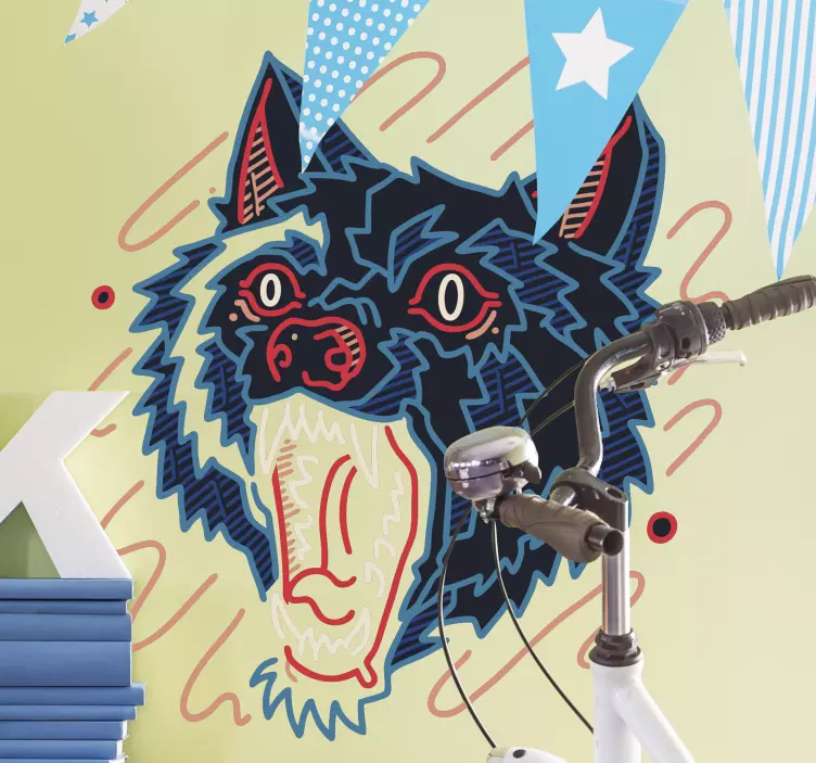 Reference: A47966A striking graphic of a howling wolf showcases bold colors and dynamic lines. The wolf's fierce expression and exaggerated features create a playful yet powerful visual, perfect for energizing any space. This design captures the essence of wildness and spirit, appealing to lovers of animals and unique art.