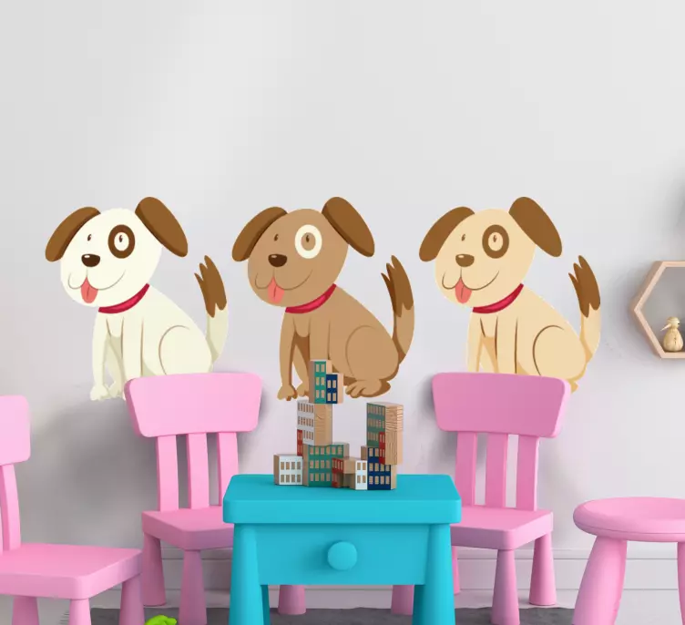 Reference: A48962A charming trio of playful puppies in cartoon style, each with unique features and expressions. This design brings a joyful atmosphere, perfect for children's spaces, appealing to pet lovers and creating a lively vibe.