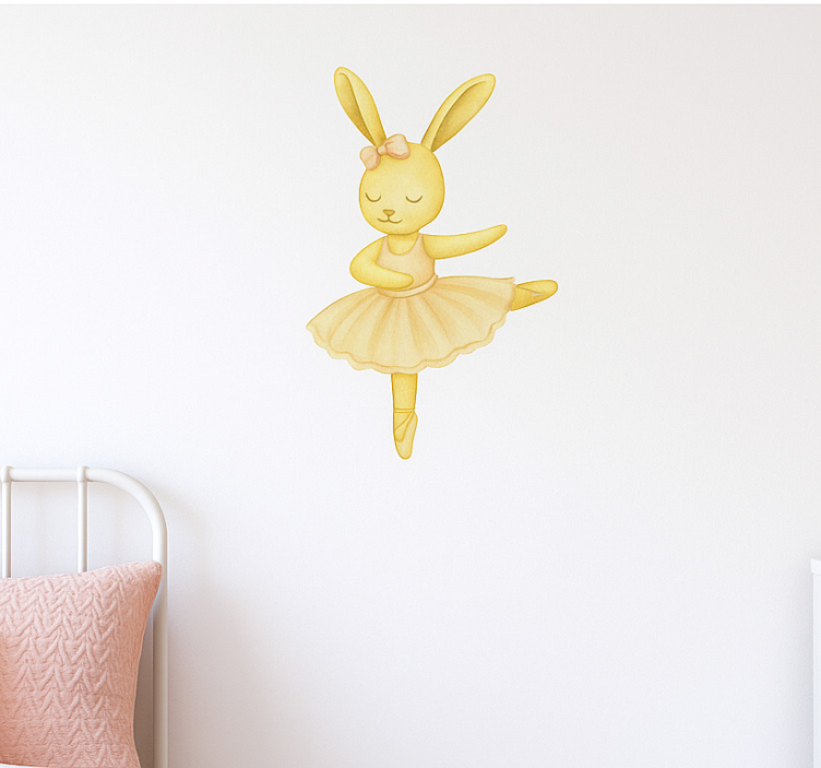 Reference: A54168Transform your child's room into a magical space with our Childrens' wall stickers adorable yellow bunny ballerinas. This delightful design features playful yellow bunnies gracefully dancing in tutus, surrounded by charming ballet elements. The vibrant colors and whimsical illustrations create an enchanting ambiance that will inspire imagination and creativity in any child’s room.