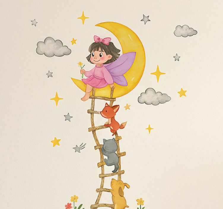 Reference: A54266Transform your child's space with our enchanting Childrens' wall stickers moon girl wall decal. This beautifully designed decal features a dreamy moon girl surrounded by stars, creating a whimsical atmosphere perfect for sparking imagination and wonder. The vibrant colors and intricate details make it a standout piece that can easily elevate any room's décor!