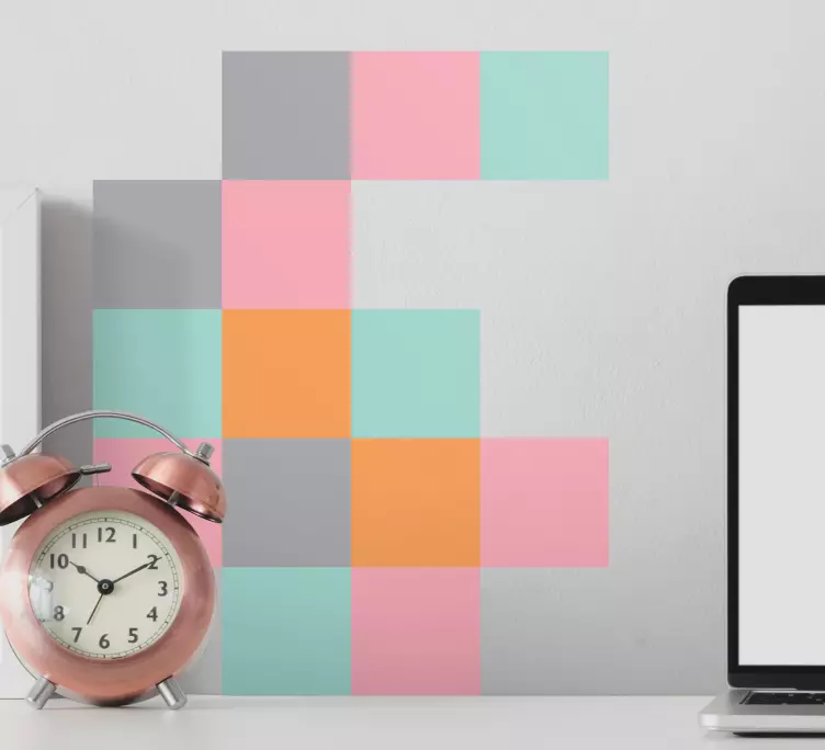 Reference: A53373A vibrant arrangement of geometric shapes, featuring soft pastel colors in a playful configuration. This design enhances any space with its eye-catching look, blending contemporary style with artistic flair. The mix of squares in varying hues creates a lively atmosphere, perfect for adding interest to a wall.