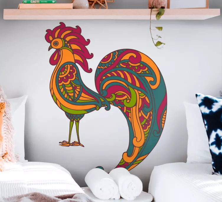 Introducing our stunning Farm animal sticker colorful rooster design, a captivating piece that showcases an ornate silhouette of a rooster, infused with vibrant colors and an ethnical flair. This decorative farm animal design is perfect for adding a touch of personality and charm to any space, making it a delightful choice for enthusiasts of farm life and art alike!
