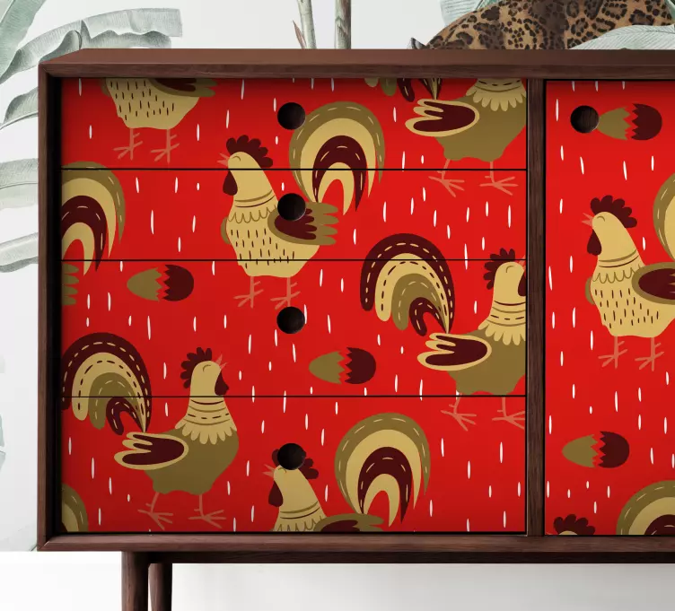 Introducing our vibrant Farm animal sticker playful rooster design, a delightful illustration that brings the charm of the farm right into your home! Featuring colorful roosters in a playful pattern, this design captures the essence of farm life with its warm red hues and lively depiction of animals. Perfect for adding a cheerful touch to your furniture or any living space, this sticker is sure to brighten your day!