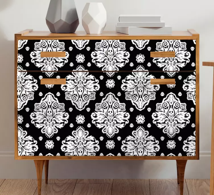 Introducing our Furniture sticker elegant pattern design, a stunning fusion of skulls and florals, beautifully intertwined with damask elements. This ornate black and white pattern is perfect for modern style furniture design, enhancing any home interior with its unique charm. Transform your space into a work of art that speaks volumes about your taste!