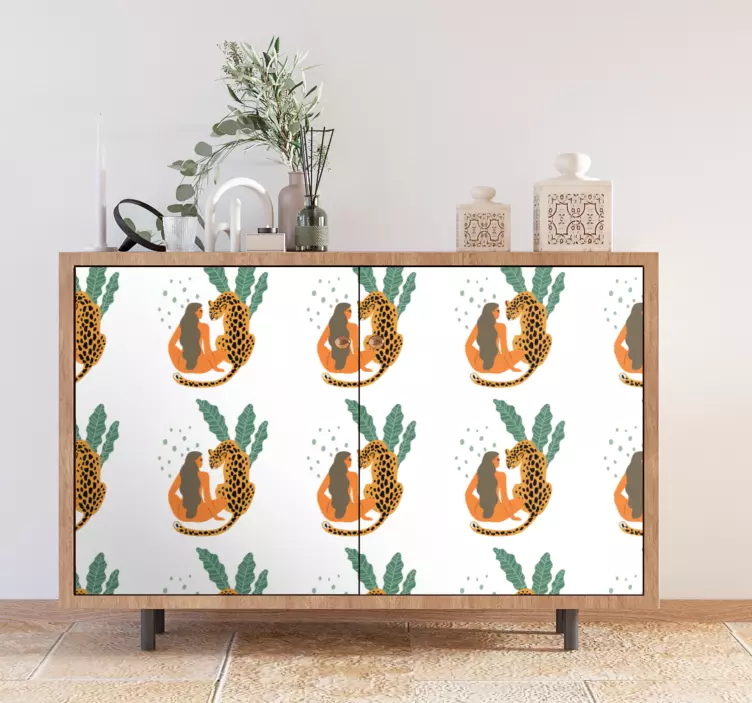 Introducing our stunning Furniture sticker leopard plant scene, a beautifully crafted design that captures the essence of nature with a whimsical touch! This hand-drawn masterpiece features a captivating woman among playful leopards, surrounded by lush tropical plants. It's the perfect blend of animal motifs and a vibrant couple's scene, effortlessly bringing a sense of adventure and warmth to your furniture.