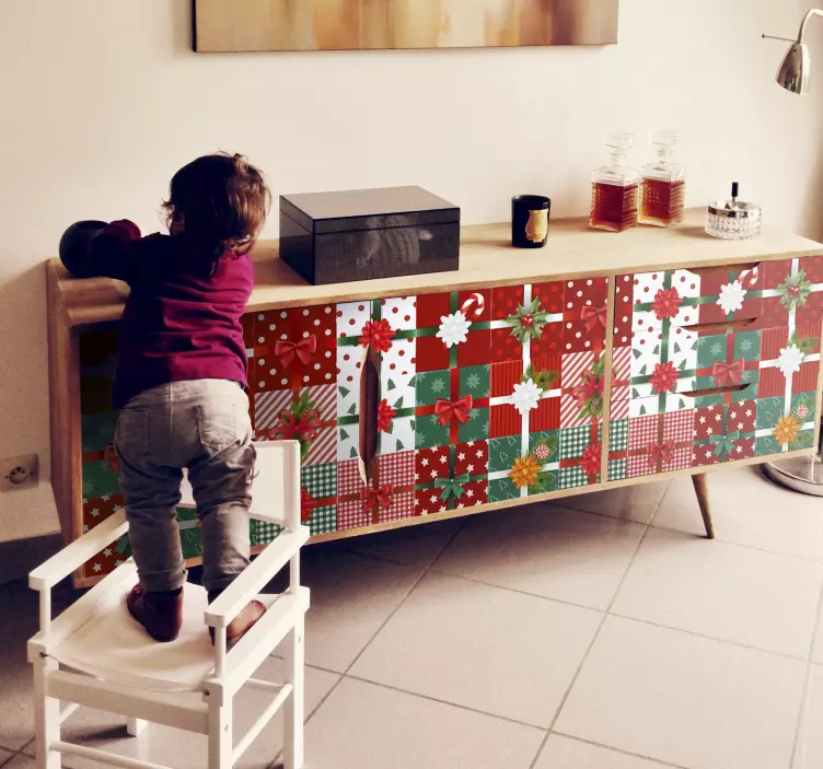 Introducing our Holiday sticker celebratory gift wrapping, a stunning design that captures the essence of the festive season! Featuring a delightful pattern of furniture, gifts, and presents, this Christmas-themed sticker is decorated with vibrant red and green hues and charming decorative bows. The squared design creates an eye-catching effect, making it the perfect addition to your holiday decor.