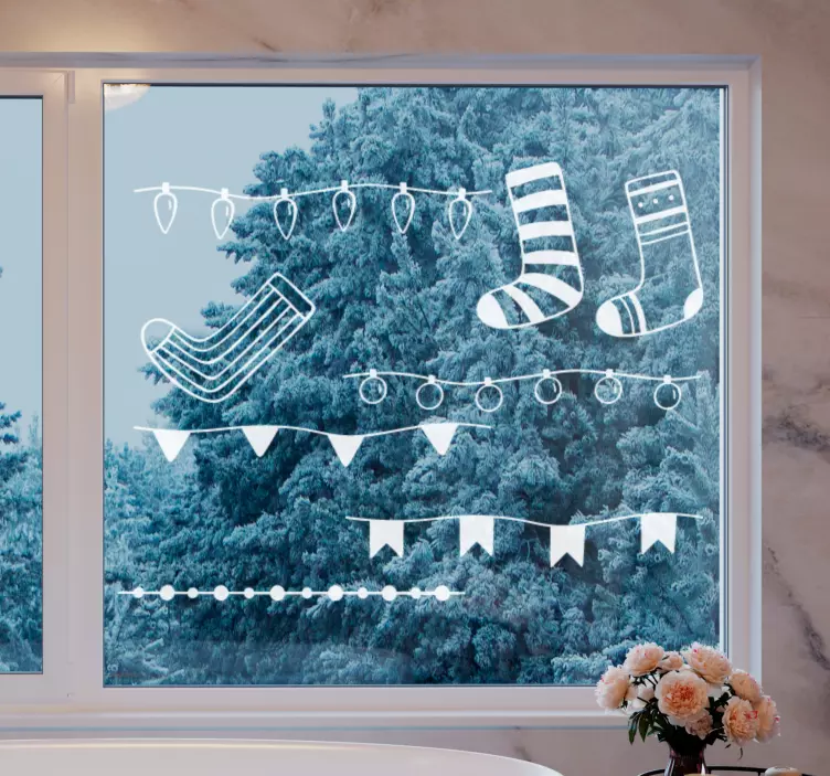 Introducing our delightful Holiday sticker holiday sock showcase, a charming design that brings the festive spirit to life! This stunning window sticker features beautifully crafted stockings adorned with Christmas ornaments, vibrant garlands, twinkling lights, and cheerful banners, perfect for enhancing your home decor during the holiday season. With its captivating design, this product is sure to fill your space with warmth and joy!