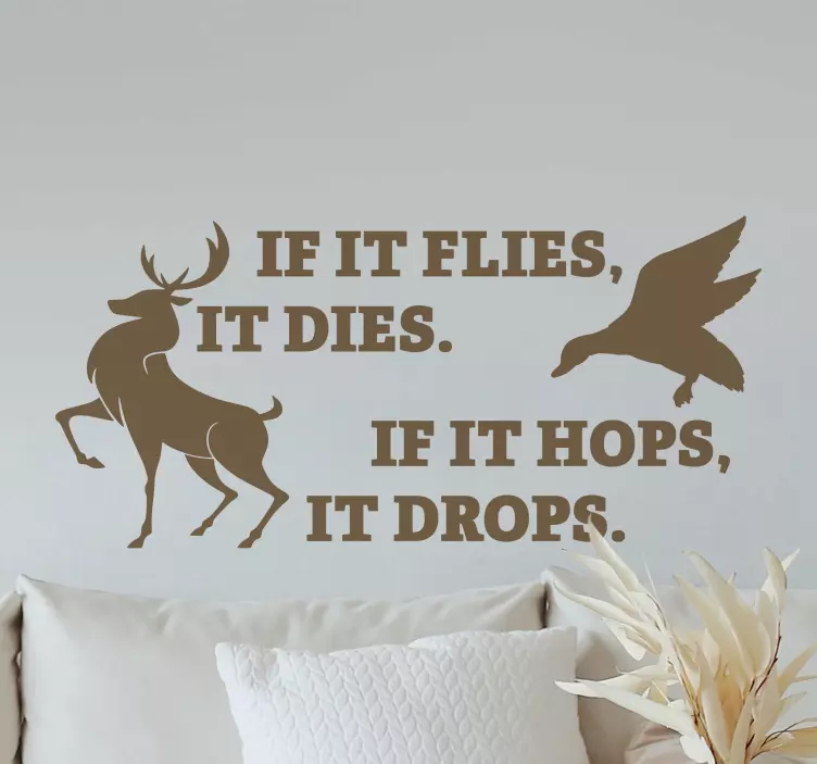 This vinyl decal features a flying bird with a hopping deer, perfect for hunting enthusiasts. The inscription reads, "If it flies it dies, if it hops it drops."