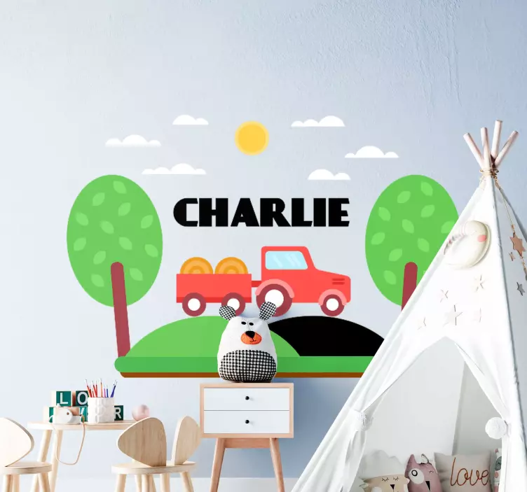 Reference: A52091A vibrant scene featuring a red truck transporting goods through lush green hills, flanked by stylized trees and a bright sun. This piece adds a playful touch to any space, making it perfect for a child's room, while allowing for personal customization.