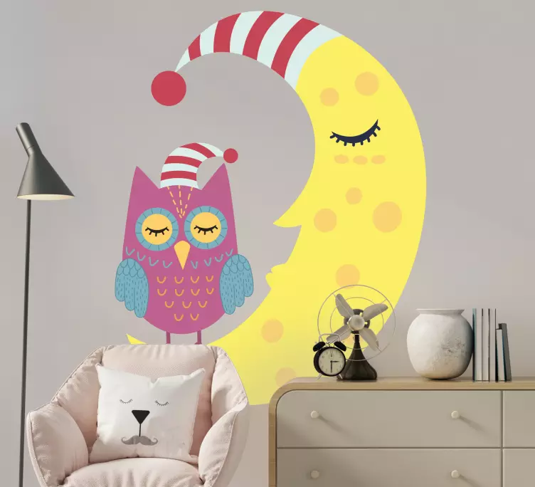 Introducing our delightful Kid's sticker drowsy owl luna, a charming decoration perfect for children's rooms! This whimsical design features a cute cartoon owl nestled against a colorful moon, capturing the essence of a peaceful night. With its vibrant colors and adorable imagery, this sleeping bird sticker will create a warm and cozy atmosphere that your little ones will love!