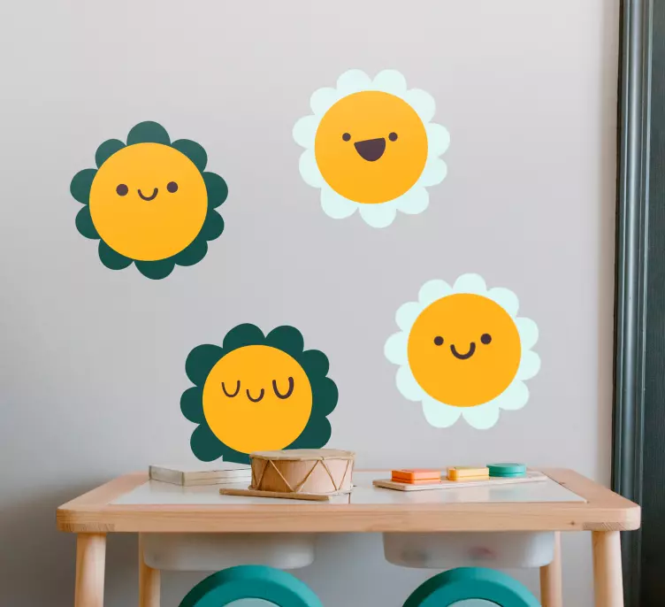 Reference: A48406Bright and cheerful designs featuring happy flower characters. Each flower has a unique expression, bringing a sense of playfulness and joy to any space. Ideal for children's environments, these elements enhance creativity and a warm atmosphere.