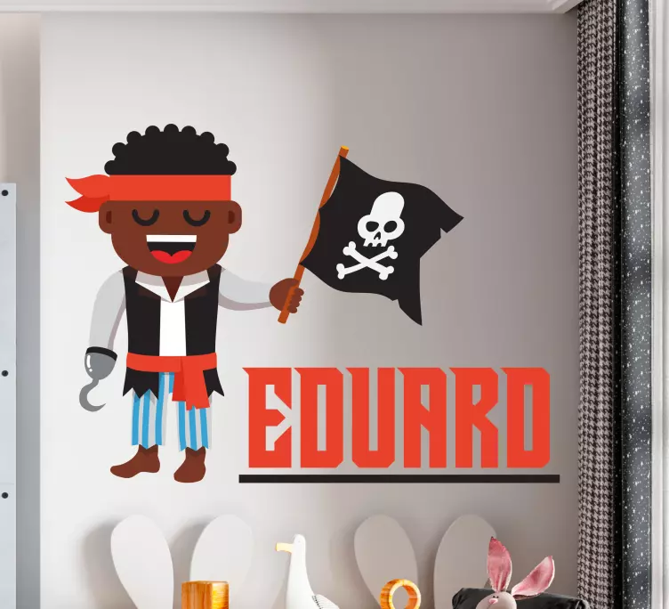 Reference: A48779A vibrant pirate character holding a flag with a skull design captures the essence of adventure and fun. This customizable product allows personalization, making it a perfect fit for children's spaces, fostering imagination and creativity in their environment.