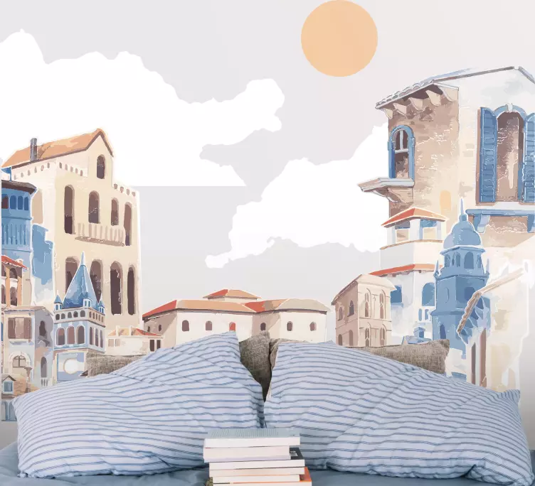 Reference: A49197An enchanting urban scene featuring beautifully crafted buildings with intricate designs. The warm sun illuminates the architecture, creating a harmonious blend of blues and neutral tones. This vibrant depiction captures the essence of a lively city, inviting exploration and wonder.