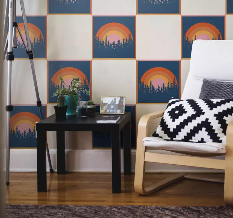Embrace the beauty of nature with our stunning Location sticker sunset forest scene. This exquisite design captures the serene essence of a sunset filtering through a lush forest, adorned with vibrant colors that evoke tranquility. With tiles creating a picturesque landscape, this artwork brings the magic of the outdoors into your space, making it a perfect addition to any room.