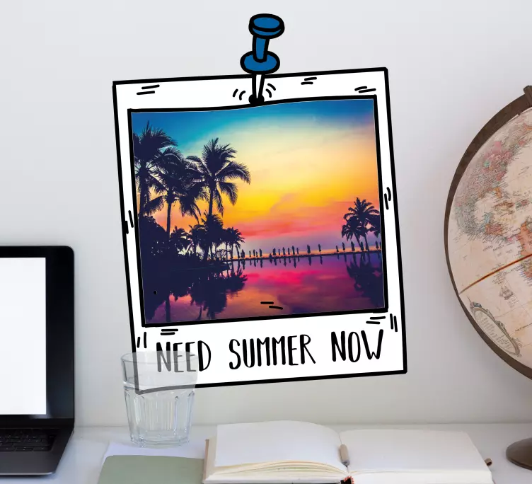 Transform your space into a vibrant oasis with our Nature wall sticker summer landscape frame, featuring a stunning graphical design that embodies the essence of summer. This delightful wall sticker showcases a polaroid-style photograph of a beach at sunset, complete with palm trees that sway gracefully in the warm breeze. The text captures the moment with a reminder to embrace the summer vibes of now!