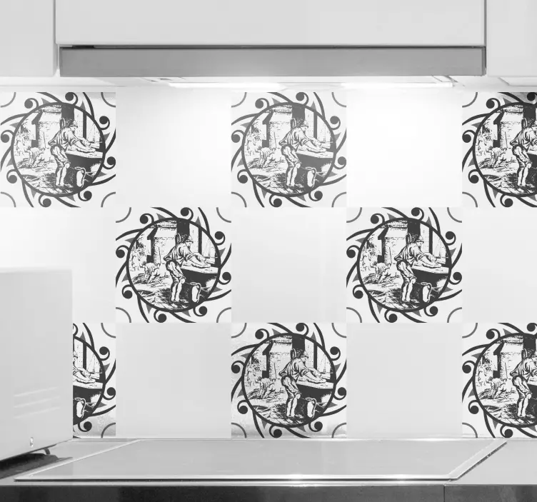 Introducing our stunning Object sticker vintage craft scene, a captivating design that seamlessly blends artistic elements with a touch of nostalgia. This unique product features a delightful combination of baking motifs, a person in an abstract style, and intricate tile engravings, all presented in striking black and white. It's the perfect way to infuse creativity into your space!