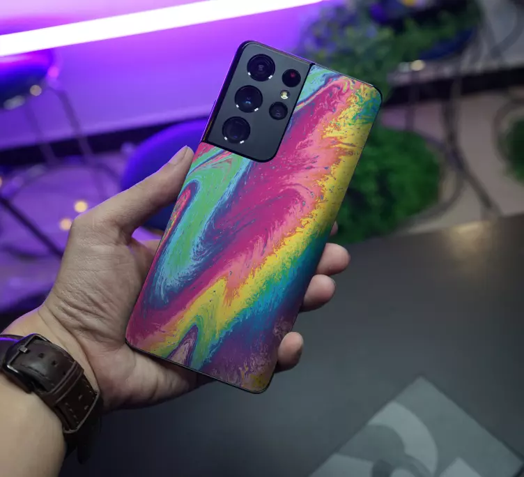 Our Samsung stickers colorful fluid swirl Samsung stickers are the perfect way to add a personal touch to your Samsung mobile phone! Their eye-catching design not only showcases your unique style but also provides a protective layer that extends your phone's lifespan. Decorate your phone with flair and make a statement wherever you go!