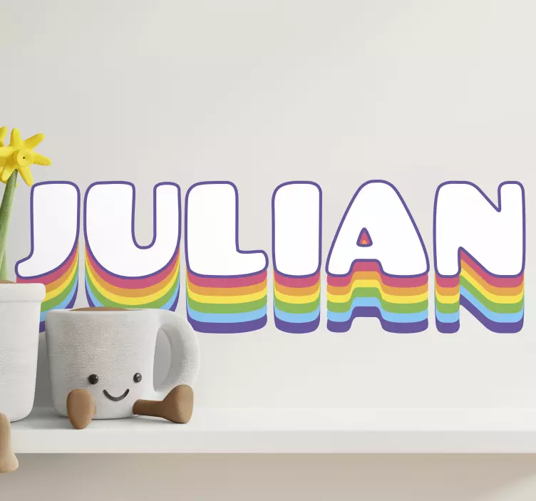 Reference: A47266This colorful name design features a playful, vibrant rainbow effect throughout the letters. Each character seamlessly integrates the spectrum, creating an inviting atmosphere. Ideal for personalizing a child's space, it adds a cheerful touch while allowing customization to reflect individuality.