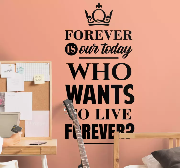 The Text sticker who wants to live forever text sticker is more than just a decorative piece; it’s an expression of your passion for life and music! Placing this sticker in your home can transform any dull space into a vibrant sanctuary filled with inspiration. Whether it’s in a living room, bedroom, or studio, this sticker serves as a daily reminder to cherish every moment. Let the powerful lyrics encourage you to pursue your dreams and create an uplifting atmosphere!