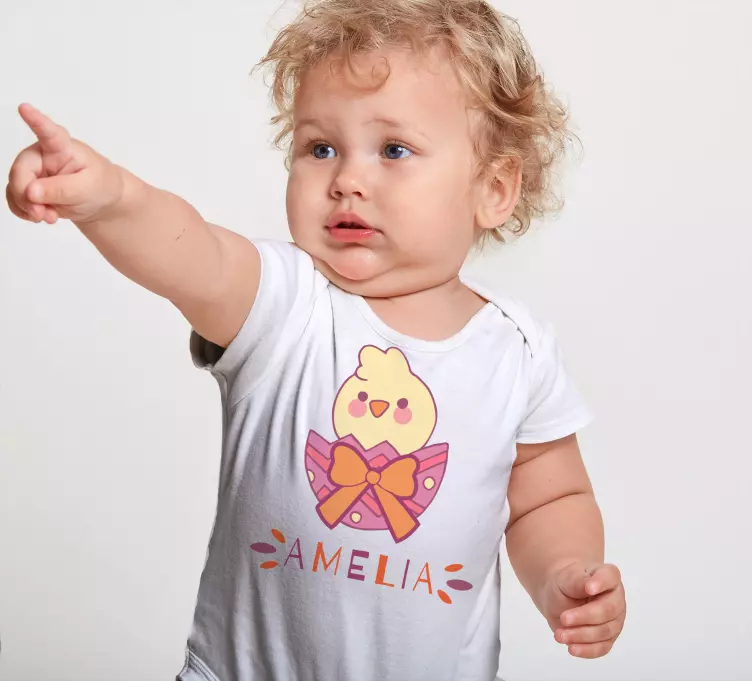 Introducing our delightful Baby t-shirt cute chick with bow, featuring an adorable graphic design that showcases a playful baby bird adorned with a charming ribbon. This colorful t-shirt is perfect for any little one, with a design that includes a cute chicken, an egg, and the option for personalization! Make it special for your little one by adding their name, turning this personalizable and customizable piece into a treasured keepsake.