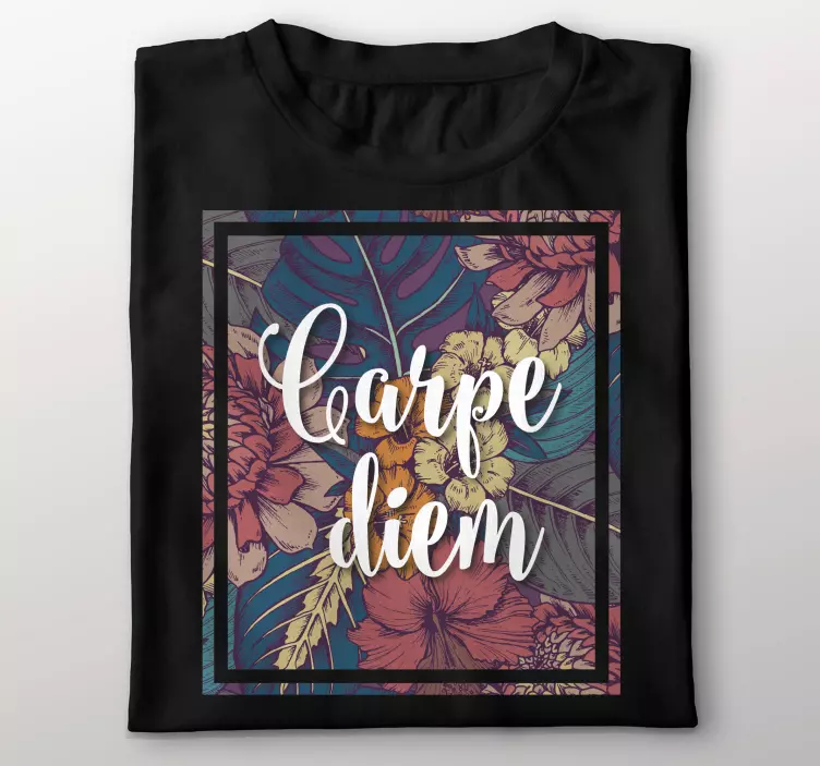 Introducing our stunning Carpe diem floral design t-shirt, a vibrant celebration of nature and motivation! This exquisite design features an array of colorful flowers and leaves, intertwined with motivational typography that beautifully conveys the essence of the Latin phrase ‘Carpe Diem’. The combination of a black background with the bright hues of nature creates a striking visual that inspires positivity and joy. This t-shirt is not just a piece of clothing; it's a statement of inspiration!
