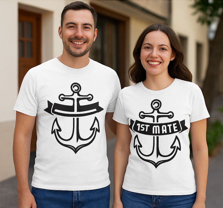 Reference: T5490Introducing our charming Couple t-shirts captain and first mate! This delightful design features a playful captain graphic paired with a first mate illustration, making it perfect for couples who love to sail through life together. Crafted from 85% cotton and 15% viscose, these t-shirts offer a soft, comfortable fit with a classic round neck and short sleeves. Available in timeless black and white, they are a stylish choice for any couple!