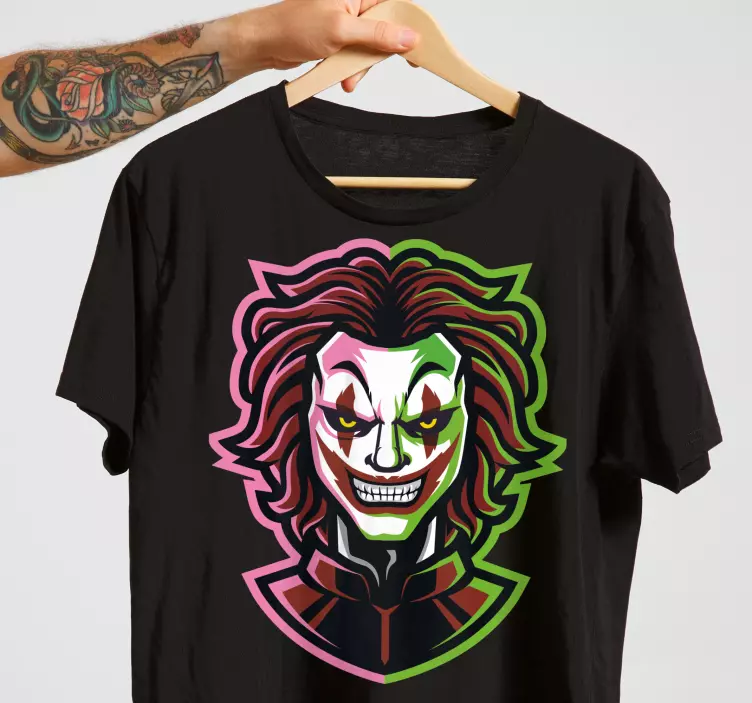 Introducing our Creepy clown character t-shirt - a vibrant and eye-catching design that features a villainous face straight out of your favorite horror movie! This graphic t-shirt showcases an illustration of a sinister clown, complete with a thrilling facial expression that brings the character to life. Perfect for Halloween or any occasion where you want to unleash your fun side, this t-shirt combines fantasy and fear in a striking way!