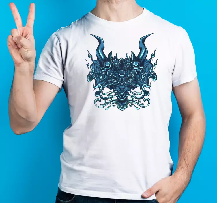 Step into the realm of fantasy with our Fierce horned creature t-shirt, featuring a stunning design of a dragon that embodies mythical allure and an air of horror. This artistic masterpiece showcases a scary, blue horned creature that captures the essence of Nipponese culture. With its bold representation of an evil dragon head, this t-shirt is a must-have for anyone who appreciates unique and eye-catching apparel!