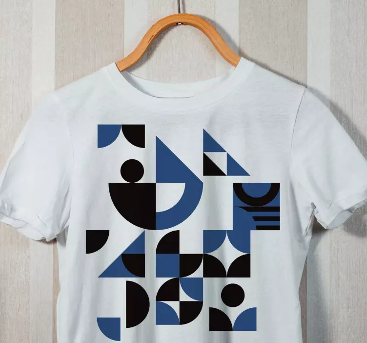 Introducing our stunning Geometric patterned t-shirt, a perfect blend of modernity and style! The design features an array of vibrant geometries and shapes that create an eye-catching abstract illustration. With a unique puzzle-like appearance, this t-shirt boasts a captivating color palette of blue and black, making it a stylish addition to any wardrobe.