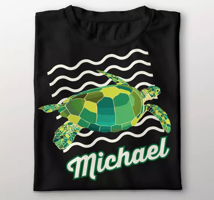 Reference: T4978This design showcases a vibrant green sea turtle swimming gracefully. The intricate patterns and colors evoke a sense of the ocean's beauty. The flowing lines in the background add movement, while the name adds a personal touch, making it a unique statement piece.