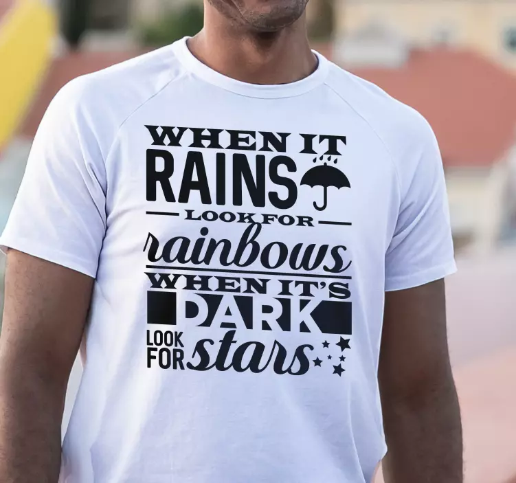 Reference: T4888This stylish top features an uplifting phrase encouraging a positive mindset. The design cleverly combines imagery of rain, rainbows, and stars, making it a thoughtful choice for anyone seeking motivation in challenging times.