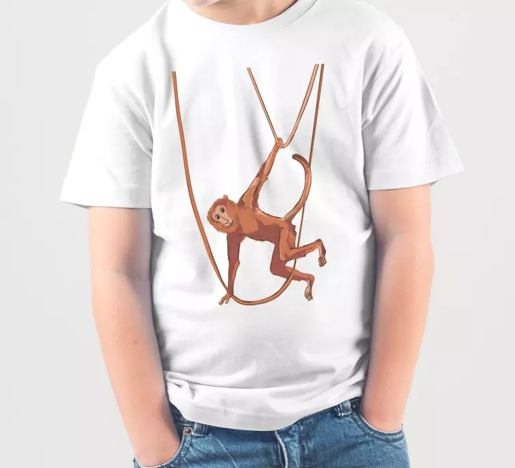 Introducing our delightful Kids t-shirt monkey swinging on a rope, featuring a captivating illustration of a playful monkey swinging through the air. This charming design showcases an adorable ape surrounded by elements of nature, making it a perfect fit for energetic children who love to express their fun-loving spirit!