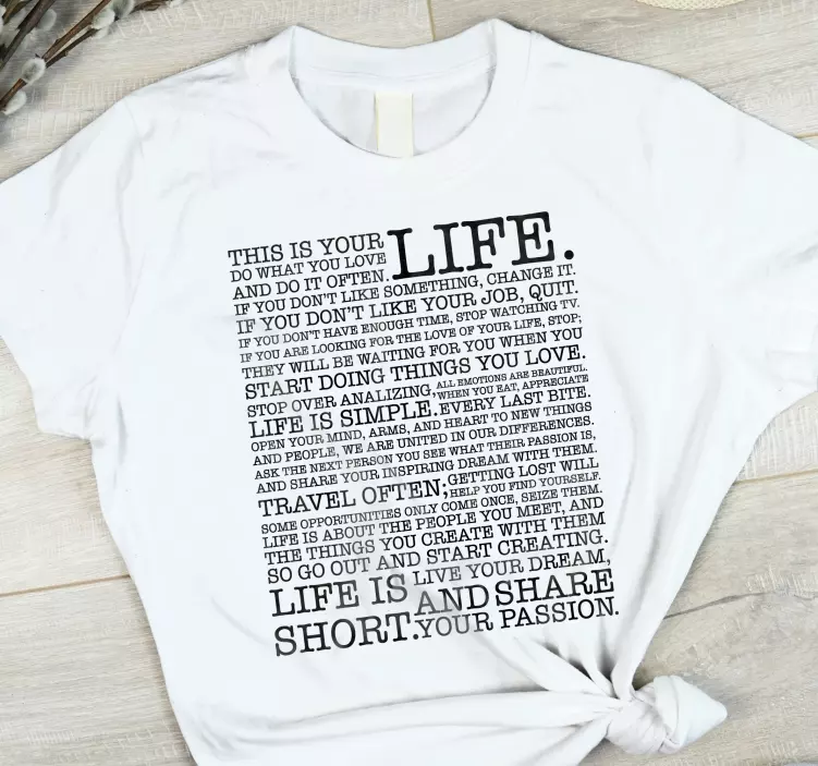 Introducing our Live your passion t-shirt, a stunning piece that beautifully combines typography and inspirational quotes to ignite your journey of personal growth and self-discovery. This design features a powerful life quote that resonates with anyone seeking motivation and positivity. The artistic use of text creates an eye-catching design that speaks to the heart, making it not just a t-shirt, but a statement of your passions!
