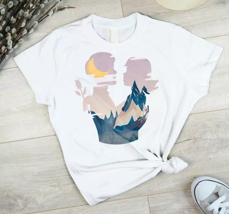 Introducing our Mother and daughter t-shirt silhouette of bonding, a beautifully crafted design that embodies the essence of familial love. This graphic illustration features a nipponese style silhouette of a mother and daughter sharing a tender moment under a moonlit sky, surrounded by majestic mountains and elements of nature. The image captures the pure tenderness of their bond, making it a perfect representation of the love between a mother and her child.