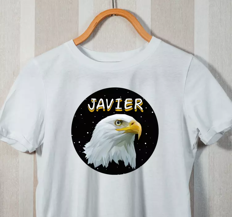 Introducing our stunning T-shirt with name eagle head featuring javier! This unique design showcases a majestic eagle head, beautifully capturing the essence of nature. With elements like stars surrounding the eagle, this personalizable piece celebrates the spirit of the wild, making it a perfect choice for animal lovers. The combination of white and yellow tones gives it a fresh and vibrant look, making it stand out in any wardrobe!