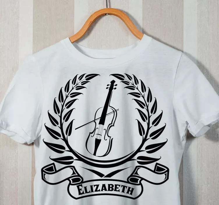Reference: T4492This unique design features a violin at its center, surrounded by a laurel wreath. The name 'Elizabeth' is elegantly presented in a ribbon beneath the emblem, signifying a personal touch. The monochromatic color scheme emphasizes the classic and refined nature of the theme.