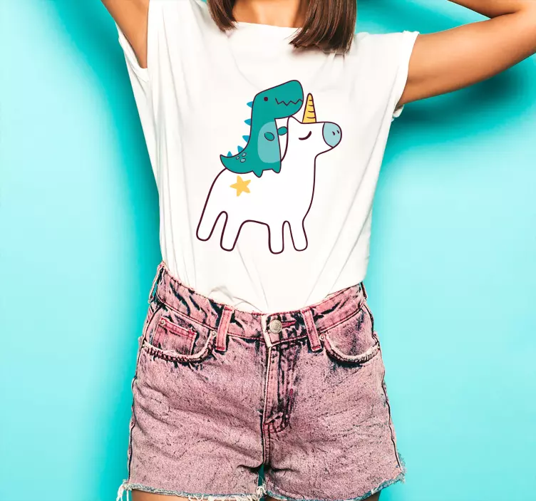 Reference: T5138This charming design features an imaginative scene with a unicorn paired with a dinosaur, creating a fun and whimsical vibe. Bright colors and adorable shapes enhance the playful theme, making it ideal for casual wear.