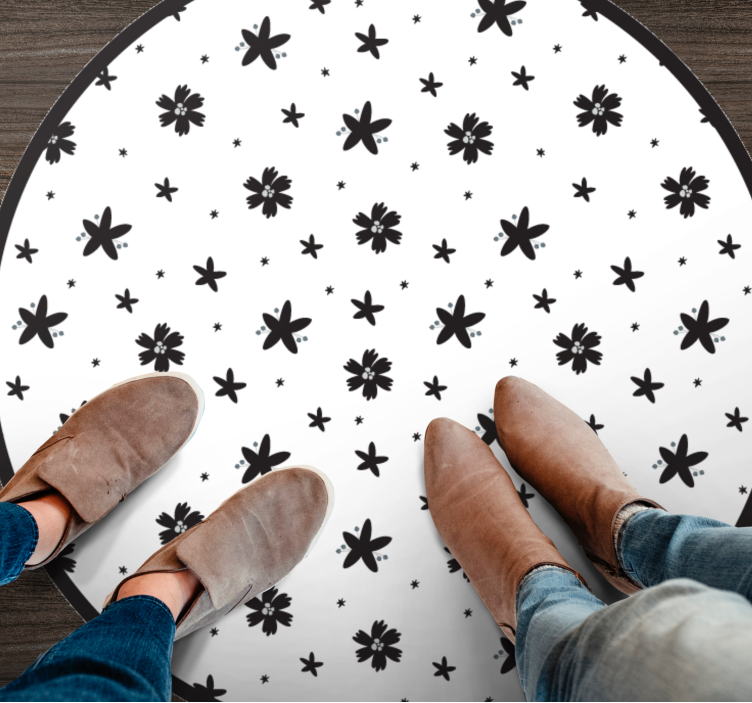 Transform your space with the stunning Floral star pattern floral vinyl carpet, a perfect blend of elegance and modernity. This design features a captivating array of flowers set against a striking black and white backdrop, showcasing a unique pattern that effortlessly enhances any room's aesthetic. The combination of black and white creates a bold statement while welcoming a touch of nature into your home.