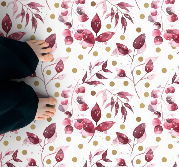 Transform your space with our stunning Floral vinyl carpet botanical print design, a captivating masterpiece that combines a hand-painted illustration of burgundy leaves with delicate watercolor touches of pink, green, and gold. This unique pattern adds a touch of elegance to any room, creating a vibrant atmosphere that invites warmth and creativity!