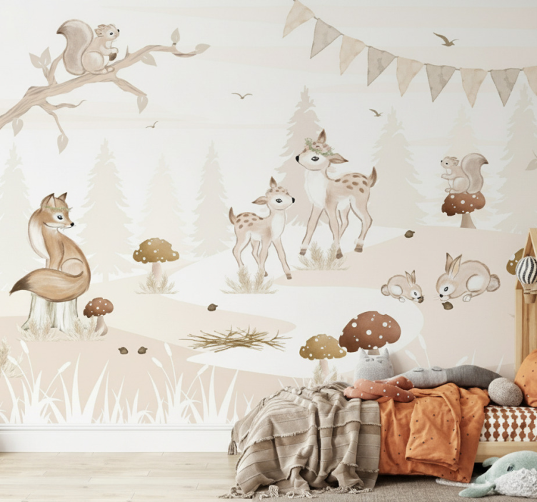 Reference: F11906Transform your child's space with our stunning Forest wall mural whimsical woodland nursery, a delightful design that captures the enchanting charm of nature. The mural features vibrant matt colors, bringing to life a whimsical woodland scene filled with friendly animals and lush greenery. This beautiful non-woven wallpaper not only elevates the aesthetics of a nursery but also creates a soothing atmosphere for your little one to thrive in!