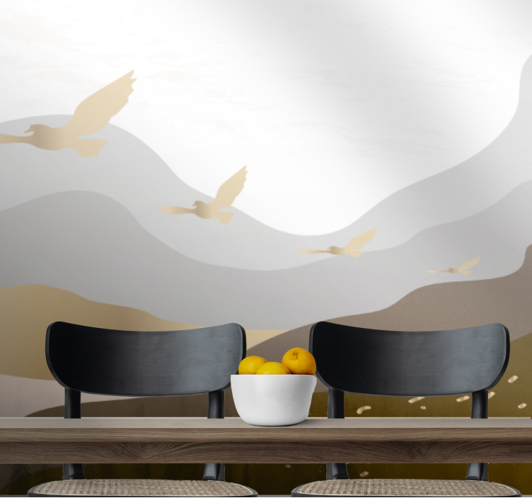 Transform your space with our Nature wall mural flying bird silhouettes, where enchanting illustrations of birds gracefully soar against a backdrop of majestic mountains. The silhouettes dance in a golden hue, bringing a touch of nature's beauty into your home. This captivating design evokes a sense of freedom and tranquility, making it a perfect addition to any room.