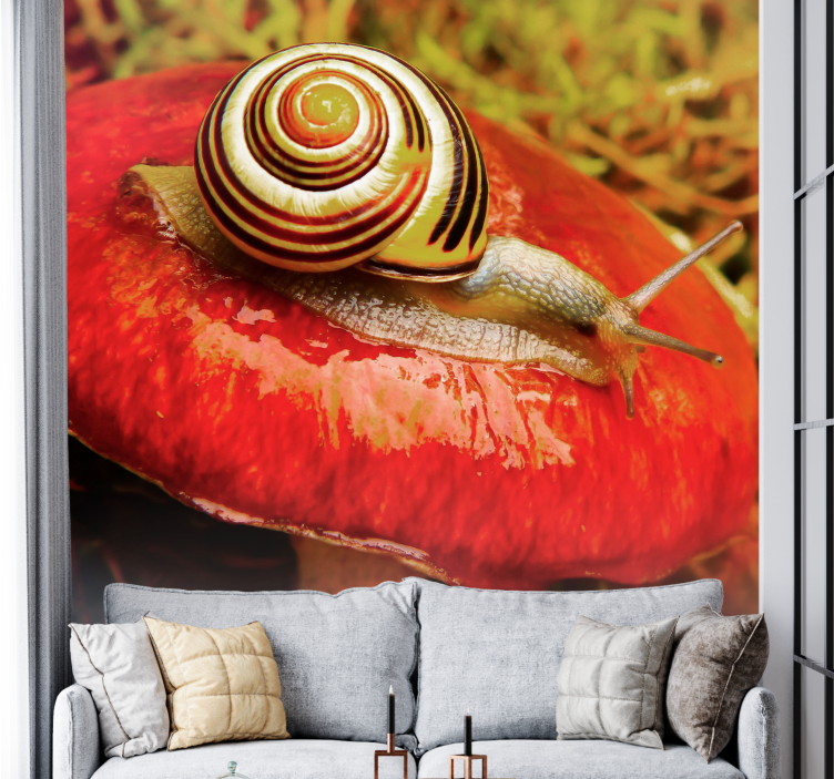 Transform your space with our stunning Other wall mural animals snail on mushroom design, featuring a whimsical snail perched atop a vibrant mushroom, set against a backdrop of lush nature. This captivating photography brings the beauty of the outdoors inside, creating a serene and enchanting atmosphere in any room.
