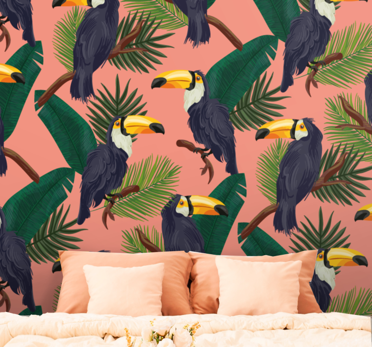 Transform your space into a vibrant tropical paradise with our Other wall mural animals tropical toucans design. This stunning design features colorful toucans perched among lush foliage and delicate leaves. The lively illustration captures the essence of the tropics, making it perfect for those who adore the beauty of nature. With its intricate pattern of birds and rich, tropical colors, this mural is sure to bring an uplifting spirit to any room!