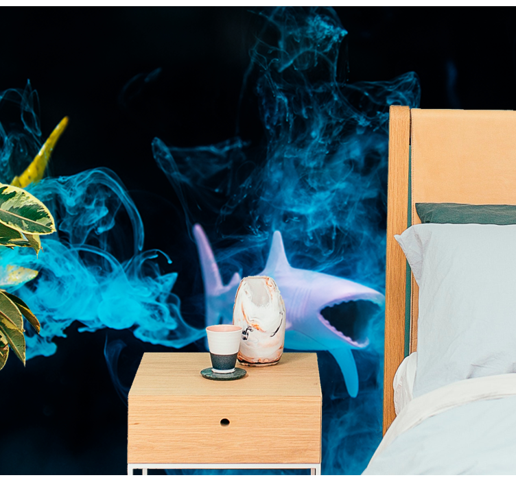 Transform your space with our stunning Wall mural animals colorful shark illustration, a mesmerizing design that brings the beauty of the ocean right into your home! This captivating mural features a vibrant shark swimming through crystal-clear waters, surrounded by ethereal smoke and rich marine life. The photomontage style immerses you in an underwater paradise, making it a perfect choice for those who appreciate the wonders of the sea.